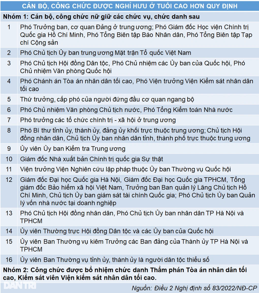 Ngoài viên chức có trình độ chuyên môn cao, các cán bộ, công chức giữ chức vụ lãnh đạo, quản lý cũng được nghỉ hưu ở độ tuổi cao hơn theo quy định tại Nghị định số 83/2022/NĐ-CP. Quy định này được áp dụng cho 2 nhóm cán bộ, công chức.