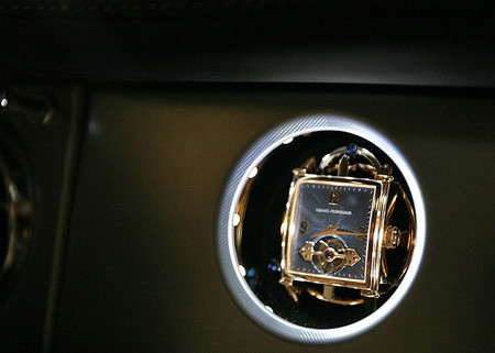 Một điểm nhấn trên xe là chiếc đồng hồ Vintage 1945 Tourbillion của hãng Girard-Perregeaux, Thụy Sỹ chế tạo thủ công, vỏ bằng vàng thật, được gắn lên khu vực bảng trung tâm và có thể dễ dàng tháo ra-gắn vào.