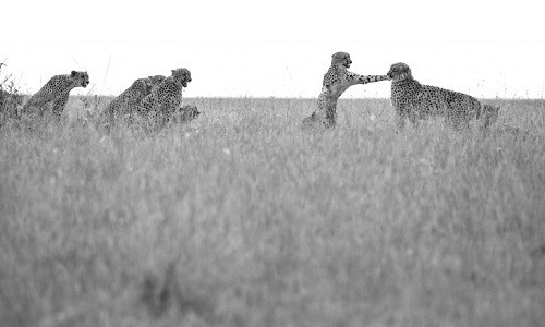 Clement Kiragu ghi hình bầy báo săn đực ngồi sắp hàng gần báo cái trong khu bảo tồn quốc gia Maasai Mara ở Kenya hôm 24/2/2018, theo Story Trender. Năm con báo đực đang cố gắng gây ấn tượng với bạn tình tiềm năng.