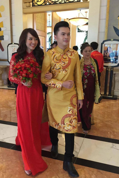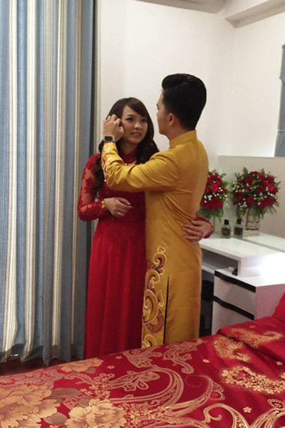 Ca sĩ "Bay giữa ngân hà" giúp bà xã chỉnh lại trang phục, đầu tóc để xuống nhà làm lễ.