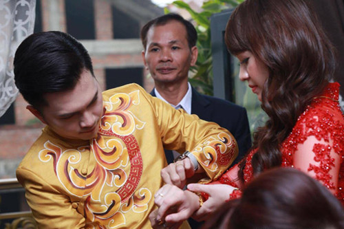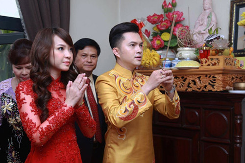 Đôi uyên ương làm lễ trước sự chứng kiến của bố mẹ và người thân.
