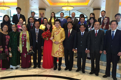 Phương Thảo và Nam Cường nhận quà chúc mừng từ người thân.