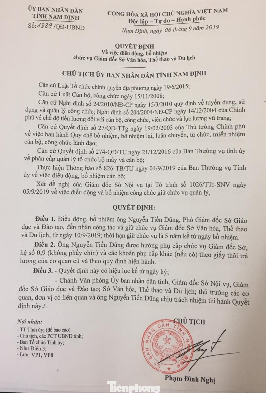 Theo đó, Chủ tịch UBND tỉnh Nam Định Phạm Đình Nghị đã ký quyết định số 1889/QĐ-UBND điều động ông Nguyễn Tiến Dũng, Phó Giám đốc Sở Giáo dục- Đào tạo Nam Định đến nhận công tác tại Sở VH-TT và DL tỉnh Nam Định và bổ nhiệm ông Nguyễn Tiến Dũng giữ chức vụ Giám đốc Sở này thay ông Khúc Mạnh Kiên đã được điều động đi nhận chức vụ Bí thư Huyện uỷ Nam Trực, tỉnh Nam Định trước đó.