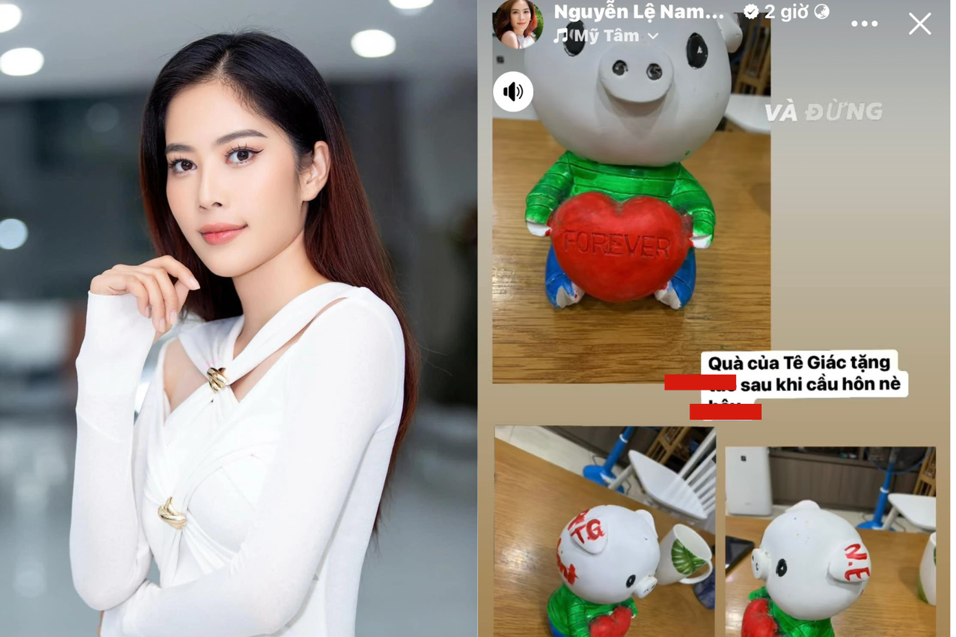 Nữ ca sĩ còn chia sẻ bức tượng một chú heo có ghi chữ NE-TG và khẳng định đây là quà sau khi "được cầu hôn". Thậm chí, Nam Em còn nhấn mạnh với bạn trai hiện tại rằng: "Vì anh giống "người đó" nên em mới rung động".
