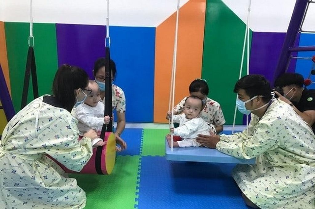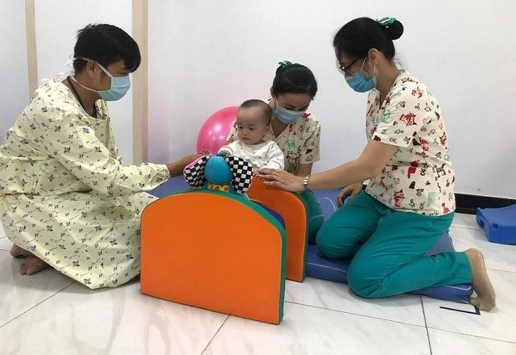 Mỗi ngày, các bé có khoảng 2 giờ đồng hồ tập đi đứng, cầm nắm, kỹ năng phản xạ.. (Ảnh: BVCC)