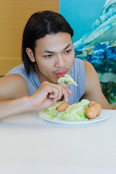 | Các thí sinh nam trai tráng cũng phải tích cực ăn rau xanh để giữ eo. |