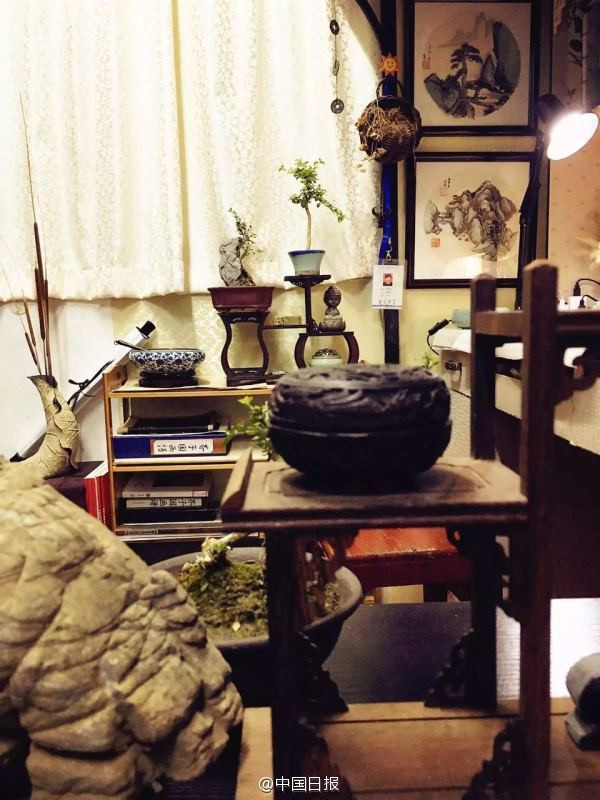 Trong căn phòng của các chàng trai còn có một khu vườn thu nhỏ, bình gốm sứ, kệ gỗ chạm khắc và tranh thủy mặc.