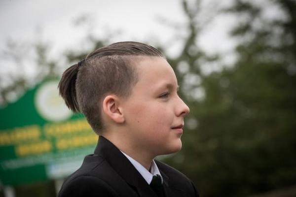 Bạn học sinh này là Tyler Brown, 11 tuổi, hiện đang học ở trường Trung học Cộng đồng Alder (Hyde, Anh). Tuần trước, khi Tyler buộc một túm tóc để tóc khỏi xòa xuống mặt, thì nhà trường bắt bạn ấy phải cởi chun buộc tóc ra.