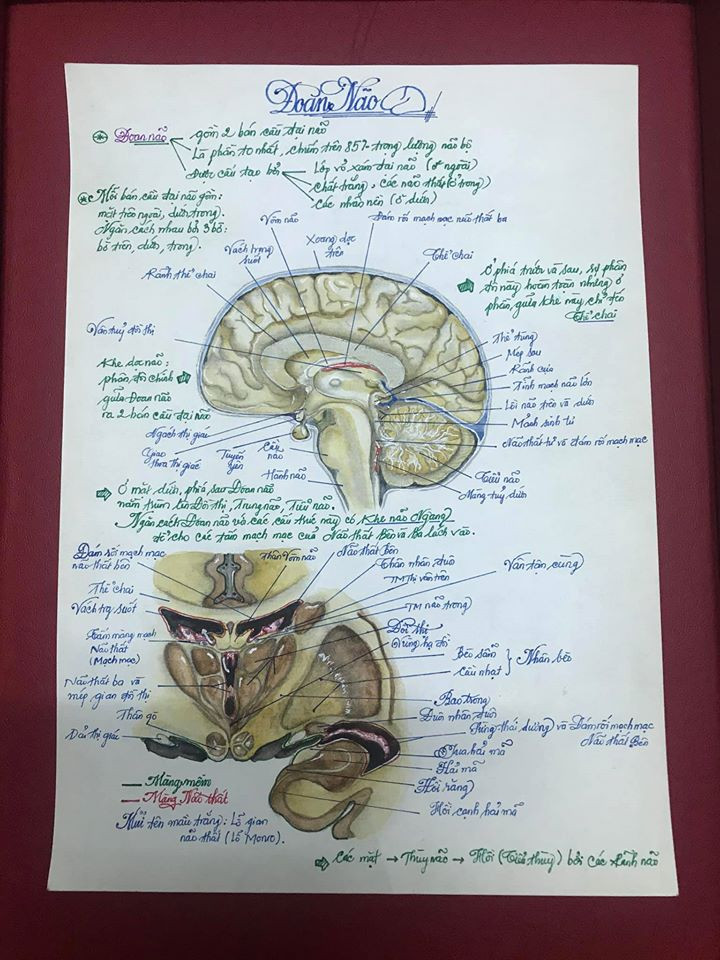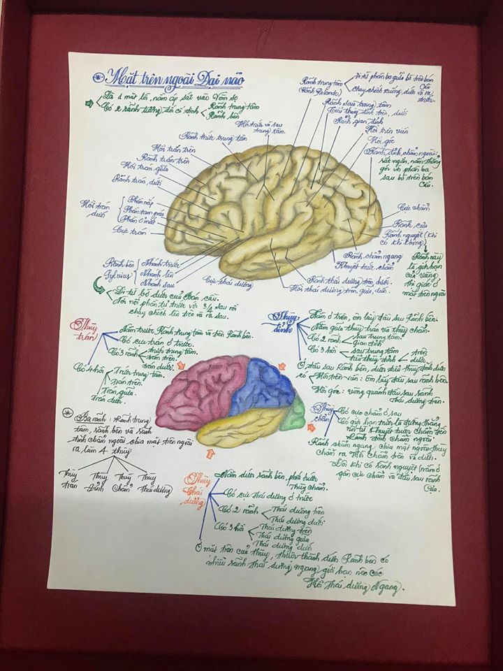 Những hình ảnh vẽ tay giải phẫu học về đại não được chàng sinh viên trẻ ghi chú tỉ mỉ đến từng chi tiết với nét chữ rất đẹp.