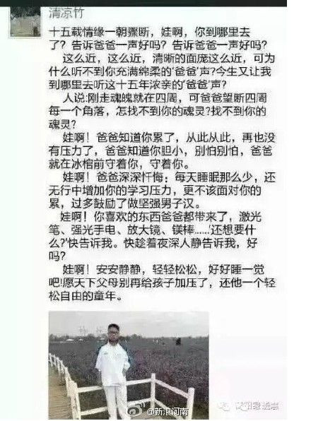 "Tôi hy vọng rằng những người làm cha mẹ sẽ không gây áp lực nhiều cho con cái của họ nữa. Yunbo tội nghiệp của tôi đã ra đi rồi. Hàng ngày, nó ngủ rất ít, hầu như chẳng ra ngoài chơi, chỉ dành thời gian chính để học. Tôi đã ngẫm lại rằng nó chủ yếu là học những bộ môn mà tôi và vợ thích, làm điều tôi và vợ muốn, chứ không phải là những điều con tôi muốn. Yunbo ơi, bố biết con rất mệt mỏi. Từ giờ trở đi con sẽ không còn bị áp lực nữa."