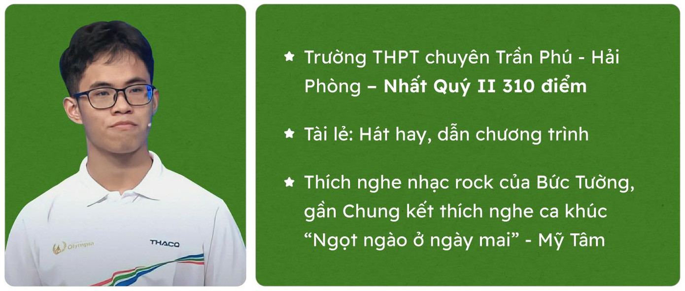 Vũ Bùi Đình Tùng, học sinh lớp 11 chuyên Toán, trường THPT chuyên Trần Phú (TP. Hải Phòng) là một trong bốn thí sinh xuất sắc nhất tham gia trận Chung kết 'Cuộc thi Đường lên đỉnh Olympia' 2022.