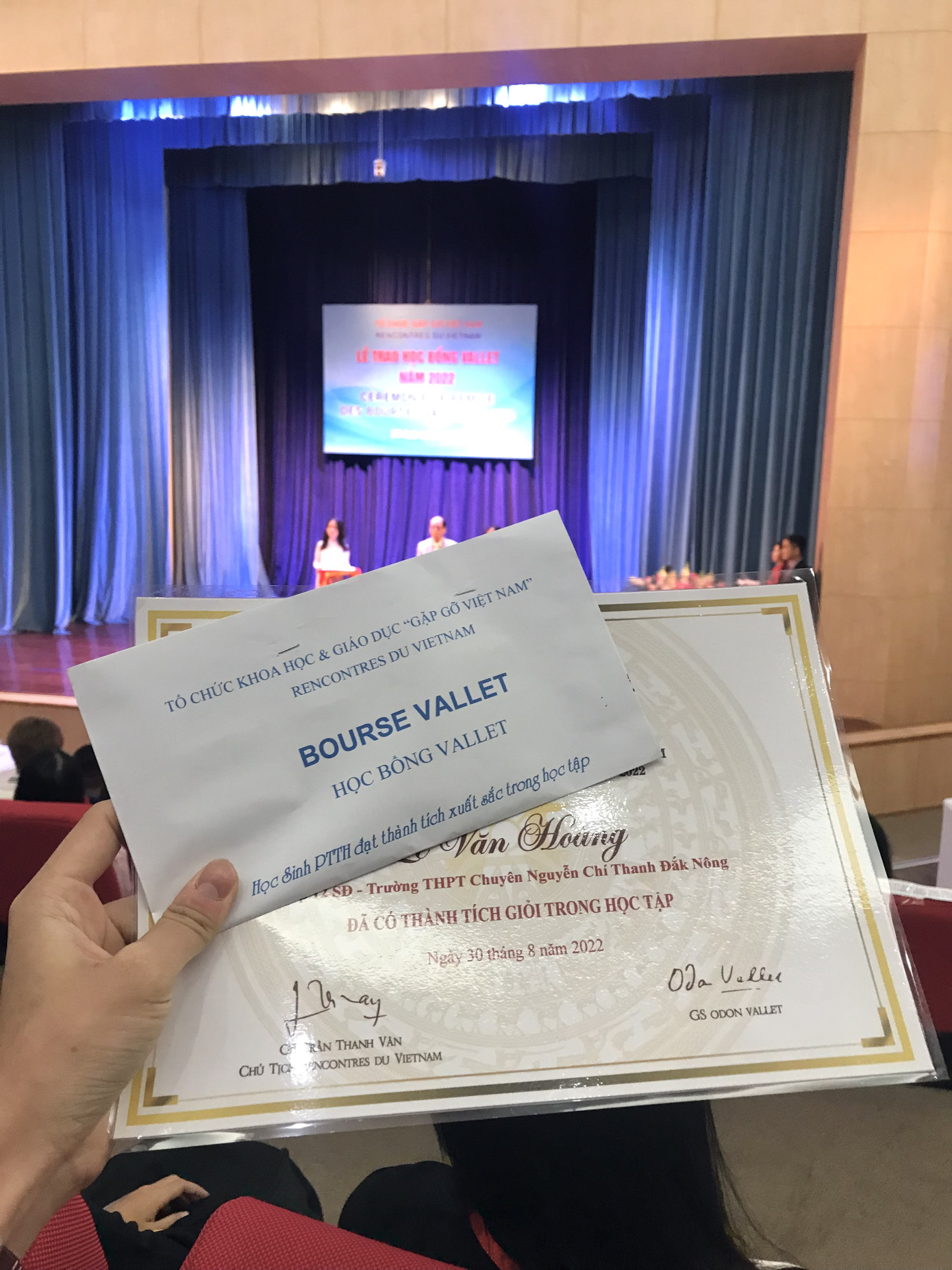 · Đạt học bổng vì em xứng đáng, học bổng Odon Vallet dành cho học sinh THPT đạt thành tích xuất sắc trong học tập được tài trợ bởi Tổ chức Khoa học & Giáo dục Gặp gỡ Việt Nam (Rencontres du Vietnam) cùng với Giáo Sư người Pháp Odon Vallet năm 2022 - 2023;