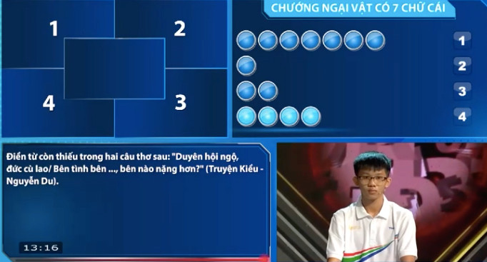 Phần thi Vượt chướng ngại vật, ẩn số chướng ngại vật có 7 chữ cái. Hàng ngang đầu tiên được lựa chọn có câu hỏi: Điền từ còn thiếu trong hai câu thơ: “Duyên hội ngộ, đức cù lao/Bên tình bên …, bên nào nặng hơn?” (Truyện Kiều, Nguyễn Du). Duy nhất, Hoàng Phước đưa ra đáp án và giành 10 điểm với “Hiếu”.