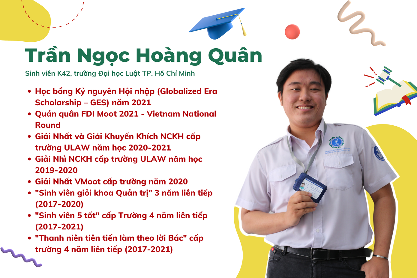Hoàng Quân hiện là sinh viên lớp Chất lượng cao Quản trị Luật K42, trường Đại học Luật TP. Hồ Chí Minh. Ngoài học tập, tham gia hoạt động Đoàn - Hội, cậu còn đam mê nghiên cứu khoa học, tìm hiểu và phân tích các vấn đề pháp lý, viết báo và đọc sách.