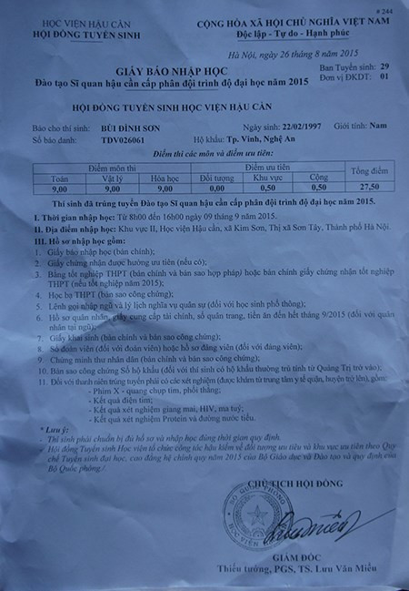 Trong đợt sơ tuyển sức khỏe thi vào các trường quân sự vừa qua, Sơn đi sơ tuyển và được Ban chỉ huy quân sự TP Vinh xác nhận là đạt yêu cầu để học các trường quân sự. Sơn đăng ký nguyện vọng khối A vào Học viện Hậu cần.