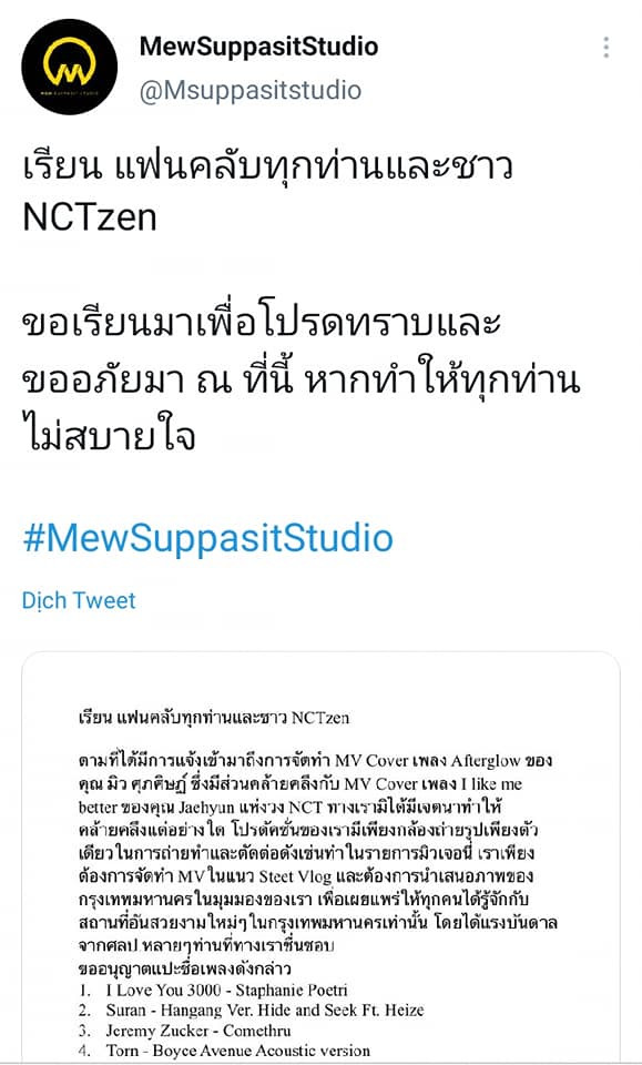 Bài đăng tố cáo Mew đạo nhái MV của Jaehyun đến từ vị trí của fan NCT Sau 2 tiếng bị tố cáo, phía Mew Suppasit Studio đã lên tiếng phủ định không có việc đạo nhái trong MV mới của Mew. Vì lý do chỉ có một máy quay và ê-kíp quay đã lấy cảm hứng từ 4 MV khác (không bao gồm MV của Jaehyun) nên việc hình ảnh giống nhau là hoàn toàn có thể xảy ra.