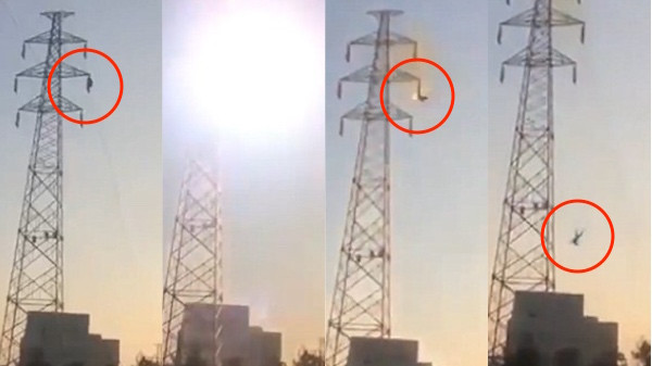 Video dài khoảng 20 giây bắt đầu bằng cảnh một người đàn ông bám vắt vẻo trên cột điện cao thế, trong khi người dân đứng xung quanh không ngừng la hét ầm ĩ.