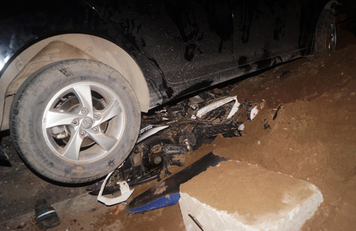 Chiếc ôtô chỉ dừng lại sau khi ủi sập barie chắn, đèn báo người và phương tiện qua lại của một công trình gần đấy. Nam thanh niên và xe bị mắc kẹt dưới gầm ôtô, bị đất đá vùi kín.