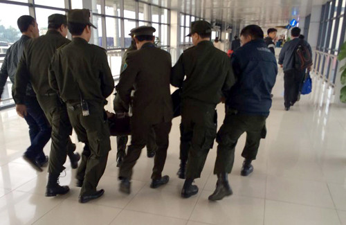 Khi lực lượng an ninh xuất hiện, nam thanh niên kêu đau bụng và lăn ra sàn, không chịu đến cơ sở y tế.