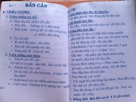 Không chỉ cung cấp cho người dân kiến thức về cách nhận biết dấu răng và phản ứng xảy ra trên cơ thể nạn nhân sau khi bị rắn độc cắn, trong cẩm nang “Hướng dẫn tự chăm sóc sức khỏe bằng y học cổ truyền”, các nhà giáo - bác sĩ - lương y Khoa Y học cổ truyền Trường đại học Y dược TP HCM còn hướng dẫn cách xử trí khi bị rắn độc cắn. Lưu ý đầu tiên phải đặt dây garô, bất động chi bị rắn cắn rồi tiến hành rửa, trích nặn hút máu tại vết rắn cắn (với điều kiện người hút máu không bị viêm lở vùng miệng). Sau công đoạn này, việc trung hòa nọc độc rất quan trọng, người bị rắn cắn hoặc người thân cần nhanh chóng hái cây cỏ có tính chát ở xung quanh nơi xảy ra rắn cắn, nhai nát vắt nước để uống, bã đắp tại chỗ vết cắn rồi đưa đến trạm y tế gần nhất. Nếu không thực hiện được phương cách ấy, có thể áp dụng các bài thuốc sau: "Trầu không 3 lá, ruột trái cau tươi 1 quả, vôi ăn trầu 5gr và vỏ quế 10gr giã nhỏ, vắt nước cho bệnh nhân uống, bã thuốc đắp lên vết rắn cắn... Lá cây kim vàng 50gr, phèn chua 10gr giã nát, vắt lấy nước uống, xác bã đắp lên vết rắn cắn".