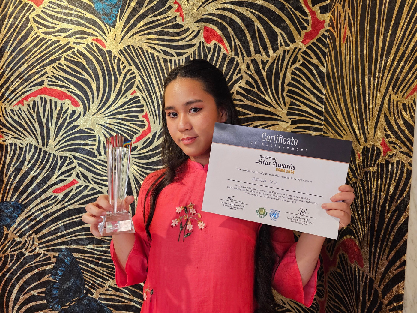 Tại Roma (Ý), 'nàng Hậu' gen Z Bella Vũ đã vinh dự nhận giải “Hoạt động thiện nguyện thanh niên” trong khuôn khổ giải The orion star awards. Đây là giải thưởng dành cho phụ nữ toàn thế giới do ban tổ chức ở Trung Đông bình chọn để thúc đẩy các hoạt động nghệ thuật, thiện nguyện, trao quyền cho nữ giới, hỗ trợ trẻ em, thúc đẩy chất lượng sống, thương hiệu hướng tới cộng đồng… Giải thưởng này ra mắt lần đầu tiên năm 2019.