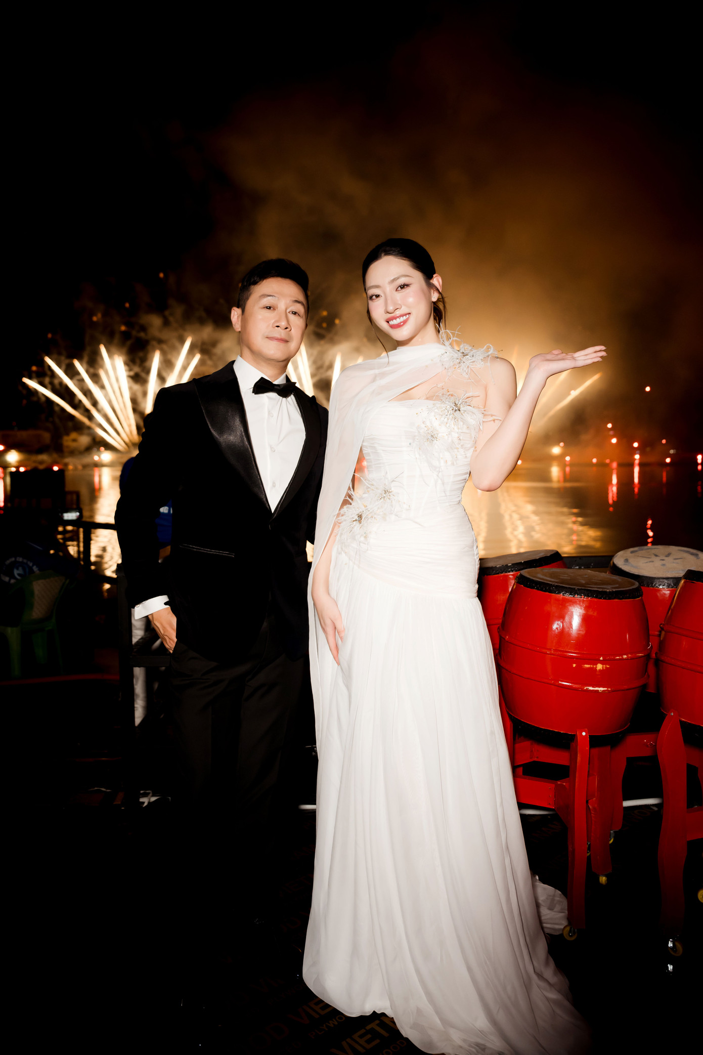 Trong đêm khai mạc, Lương Thuỳ Linh còn diện thêm bộ cánh trắng vô cùng lộng lẫy đến từ nhà thiết kế Đỗ Long, được biết chiếc váy được anh ráo riết làm riêng cho 'nàng Hậu' trong thời gian ngắn để kịp cho đêm khai mạc lễ hội.