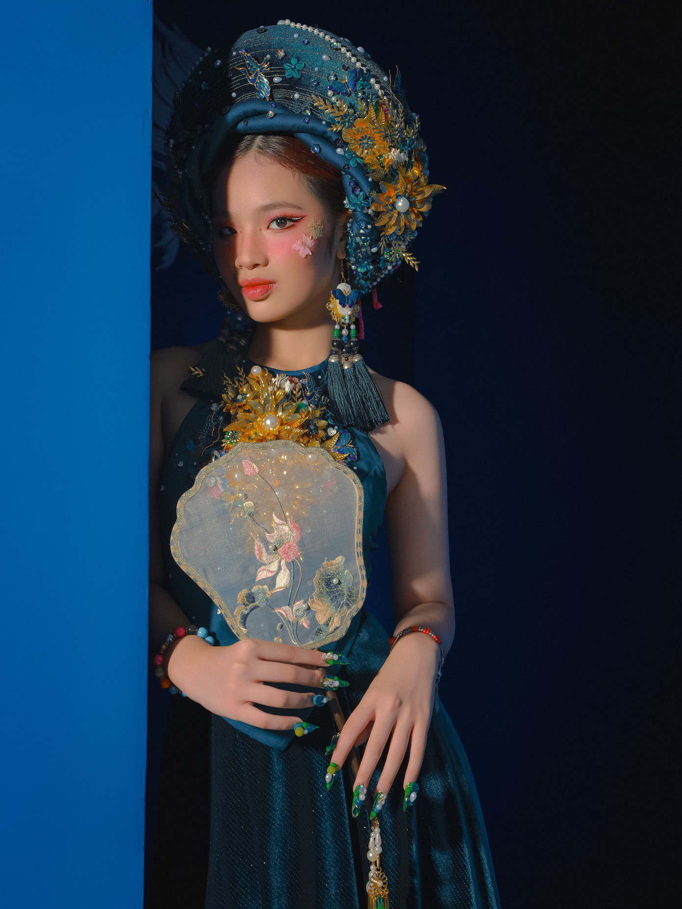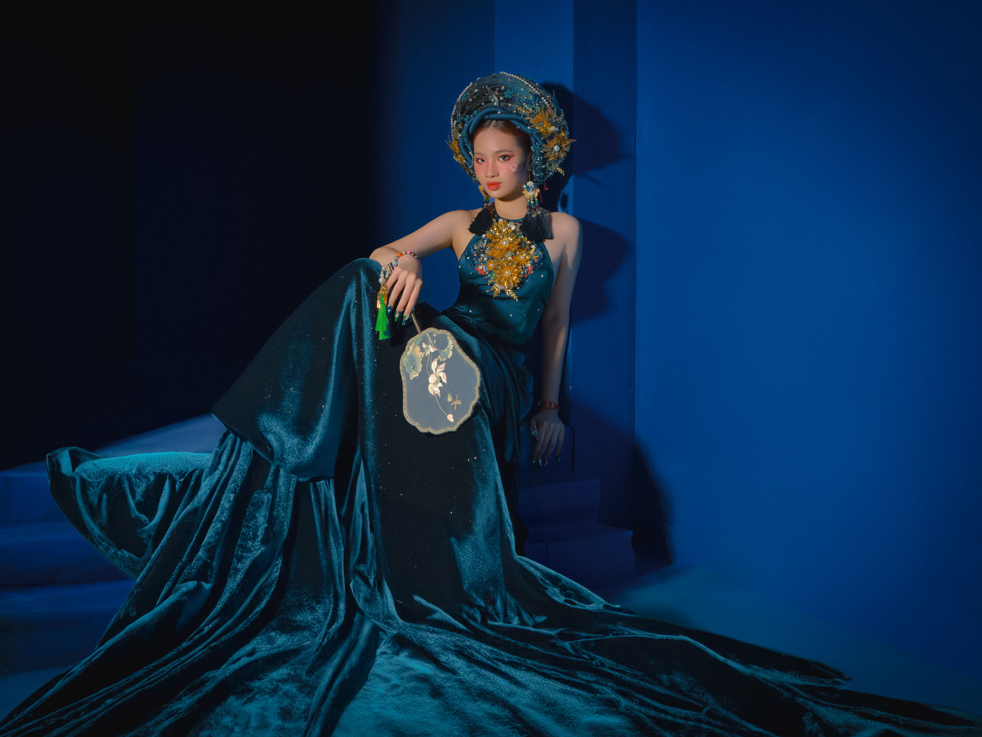 Ở bộ ảnh này, Bảo Hà đã mang đến 5 thiết kế với 4 concept ấn tượng đi từ 'mỹ nữ truyền thống', 'nữ thần Tây Bắc' đến cô nàng gen Z hiện đại. Trong thiết kế đầu tiên, Bảo Hà lựa chọn trang phục truyền thống là áo yếm cùng phần váy dài tone xanh khoe trọn bờ vai thon thả. Với thiết kế đậm chất truyền thống cùng những họa tiết đính đá tỉ mỉ, Bảo Hà như hóa thân thành một 'mỹ nữ' yêu kiều, dịu dàng, đằm thắm.