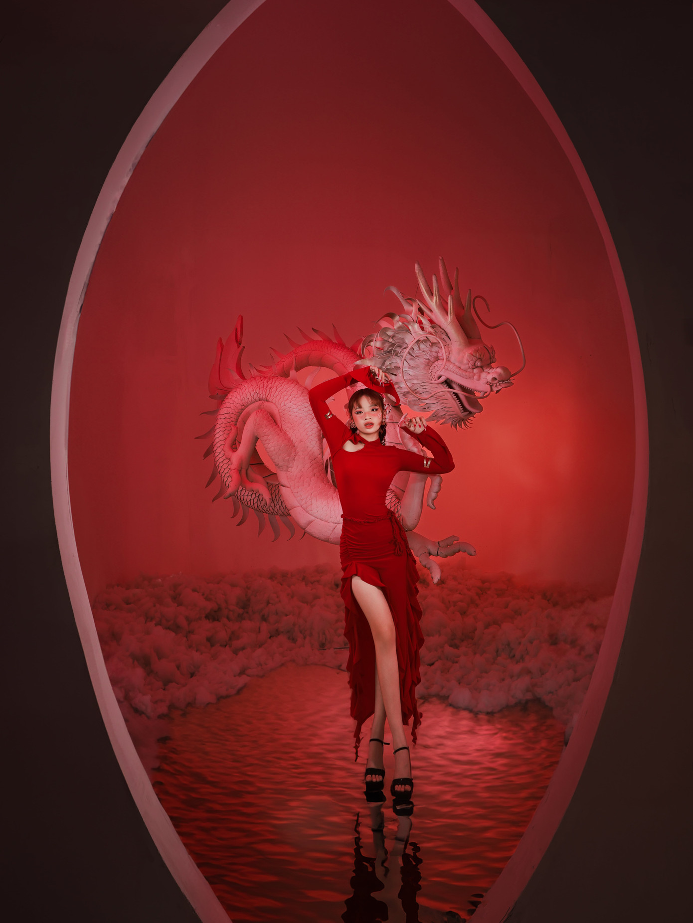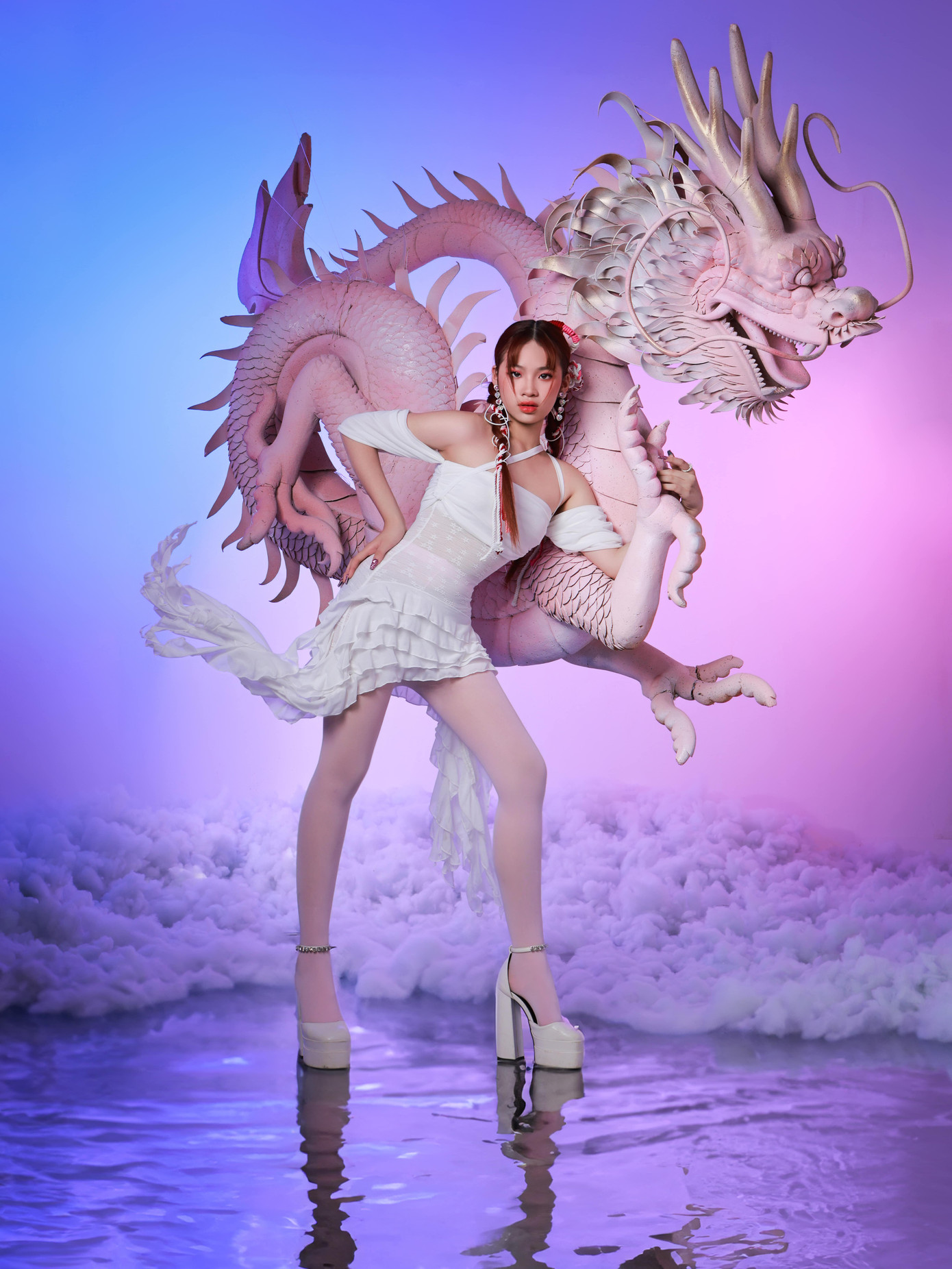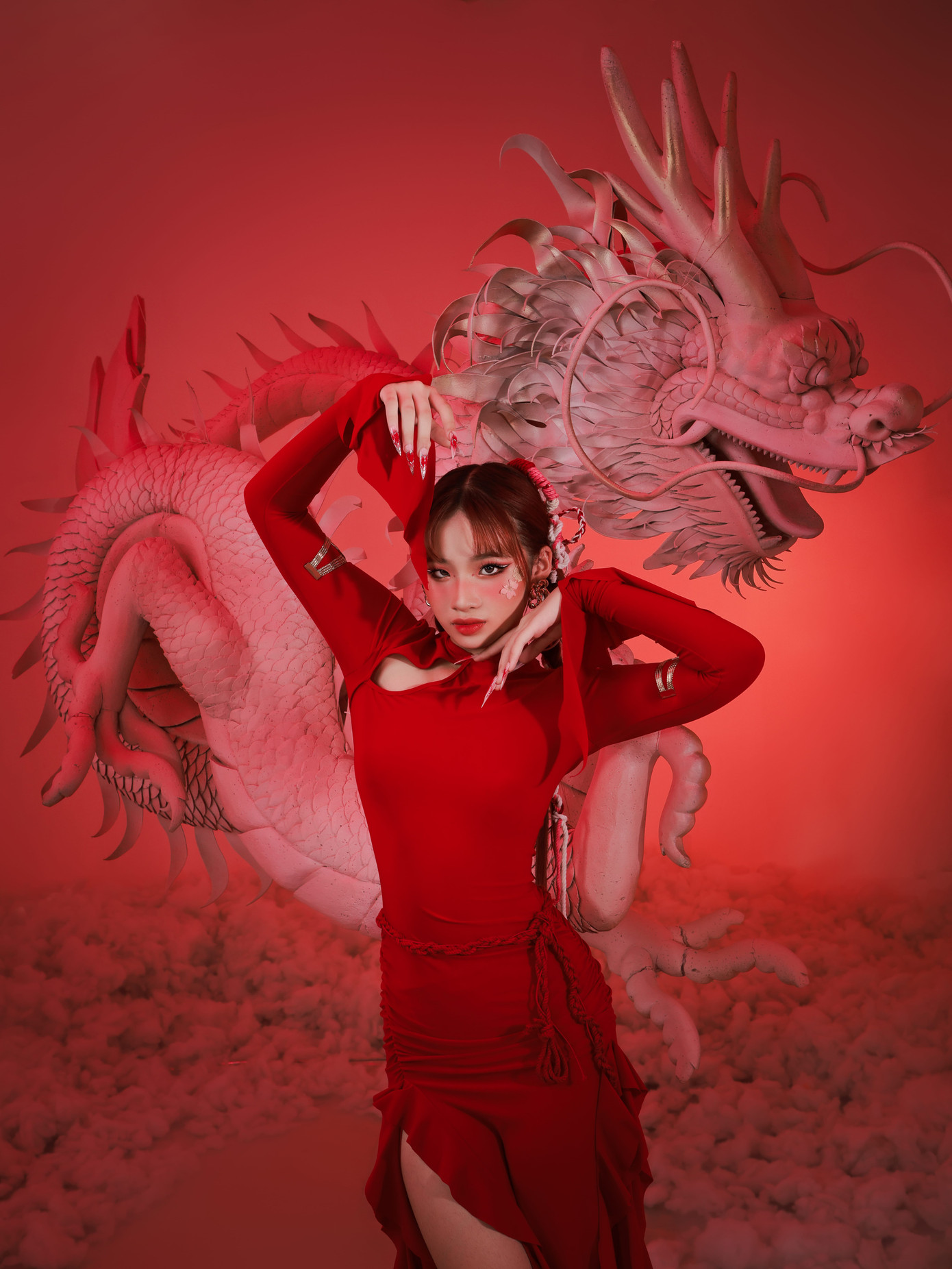 Ở thiết kế thứ ba, Bảo Hà đã mang đến một câu chuyện hiện đại của cô nàng gen Z vào ngày Tết. Mang tư duy thời trang hiện đại, gen Z này không chỉ gây ấn tượng với lối pose dáng chuyên nghiệp mà còn khéo léo mang hình ảnh rồng 3D vào bộ ảnh. Đầu tư thực hiện linh vật rồng khổng lồ, Bảo Hà khiến khán giả phải choáng với 'độ chịu chơi' cho sản phẩm đầu năm của mình.