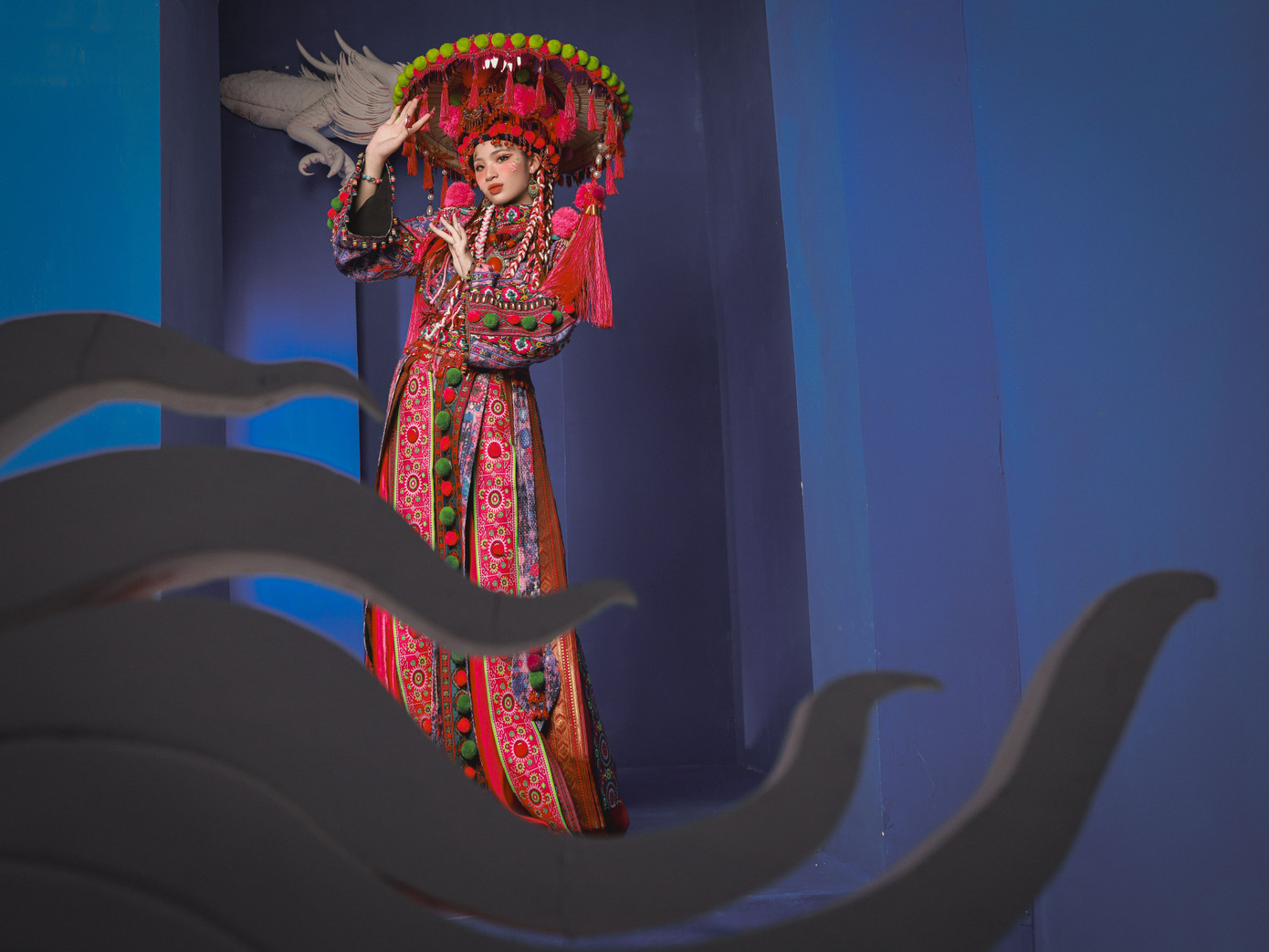 Với thiết kế thổ cẩm đặc trưng của người dân H’Mông, Bảo Hà hóa thành “nàng Mị” với thần thái tươi tắn, mang chút tinh nghịch, tươi vui đúng với tinh thần ngày Tết. Diện thiết kế cầu kỳ song Bảo Hà vẫn xử lý tốt từ thần thái đến tạo dáng để có những bức ảnh 'đắt giá' tại shoot ảnh này.