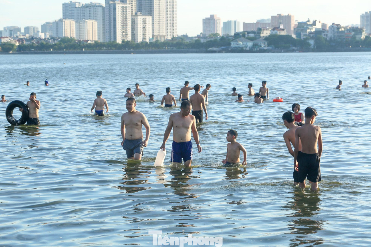 | Hồ Tây không chỉ là nơi hóng mát mà còn là một “bể bơi” khổng lồ để người dân bơi lội trong những ngày nắng nóng gay gắt. |
