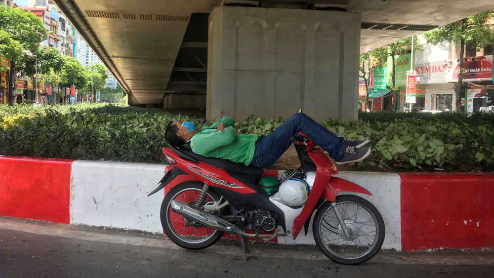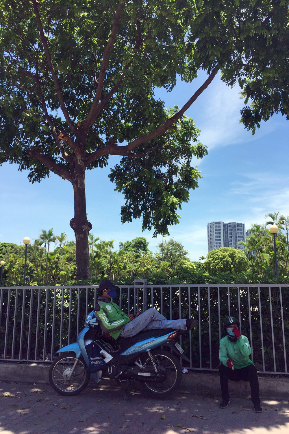 Gầm cầu, bóng cây là những nơi mà những người chạy xe ôm “công nghệ” nghỉ mát mỗi khi không có khách.