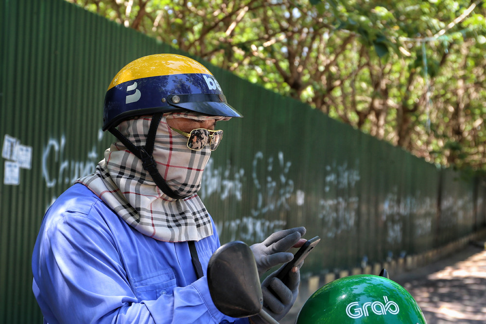 Khẩu trang, mũ, áo dài tay chống nắng là những vật dụng thiết yếu mỗi khi ra đường của người dân lao động.