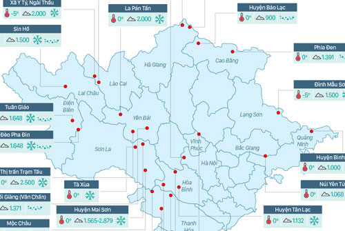 Quá trình tăng nhiệt rõ nhất là ở các tỉnh vùng núi phía Bắc khi nhiệt độ thấp nhất đồng loạt tăng 1-3 độ C, nhất là Mẫu Sơn (Lạng Sơn) đã lên 3 độ C (tăng 6 độ. Đến 6h sáng nay, không còn địa phương nào dưới 0 độ C nhưng vẫn ở mức thấp dưới 8 độ C. Trong đó thấp nhất là Pha Đin (Điện Biên) 2 độ, sau đó là Đồng Văn (Hà Giang) 3 độ, Mộc Châu (Sơn La) và Sa Pa (Lào Cai) 4 độ C.
