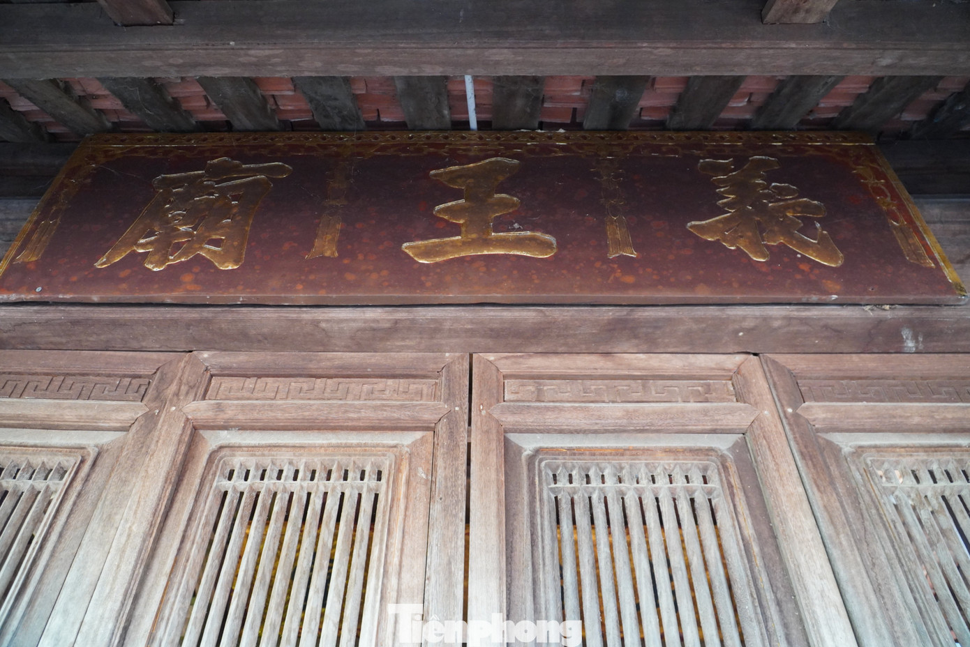 | Phần mái, hoạ tiết khắc họa trên vân gỗ tạo nên nét cổ kính, linh thiêng của ngôi đền. |