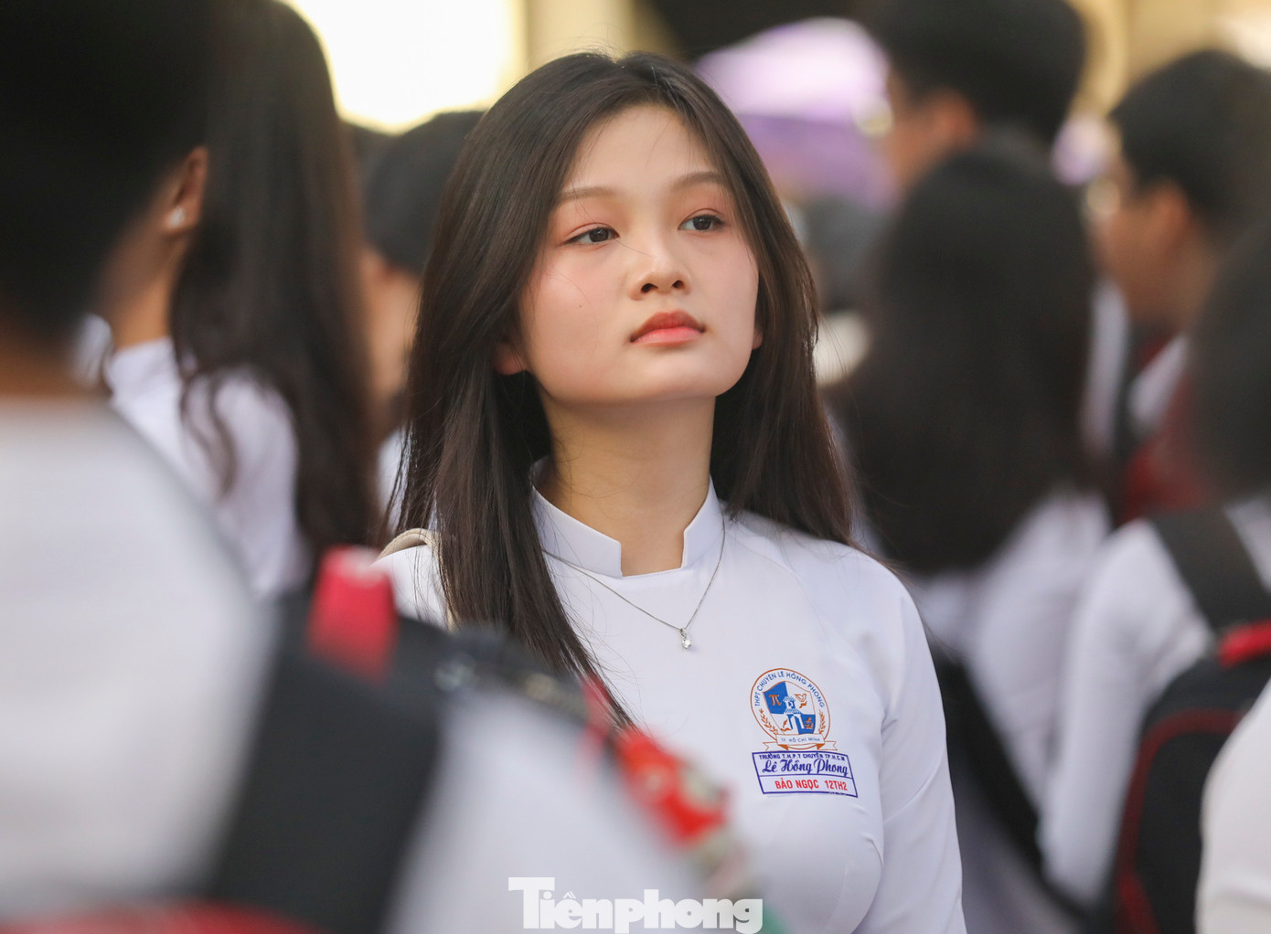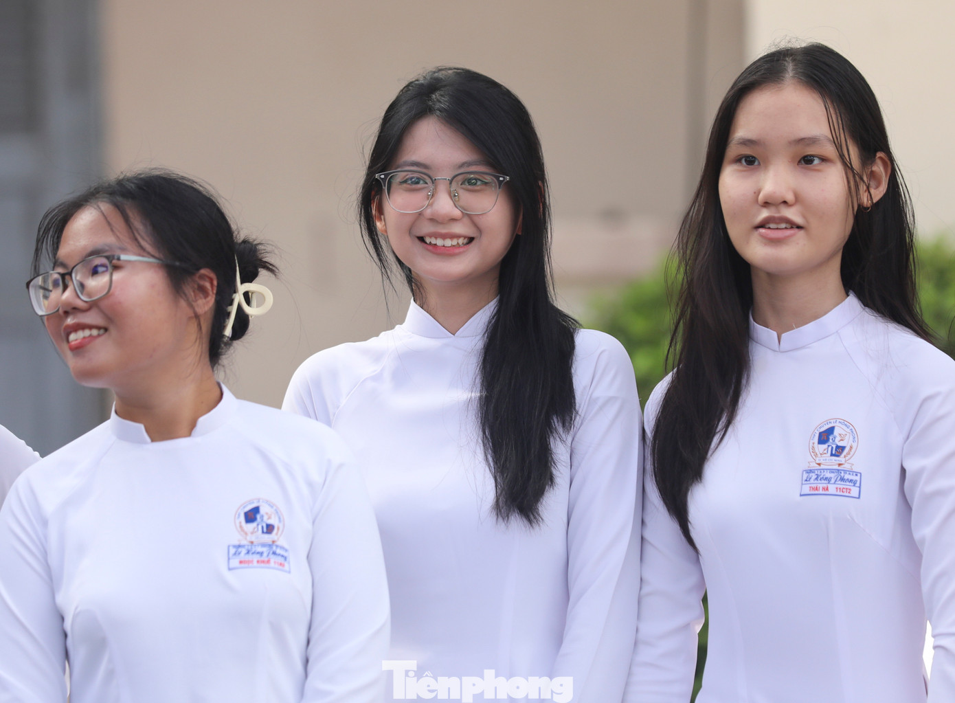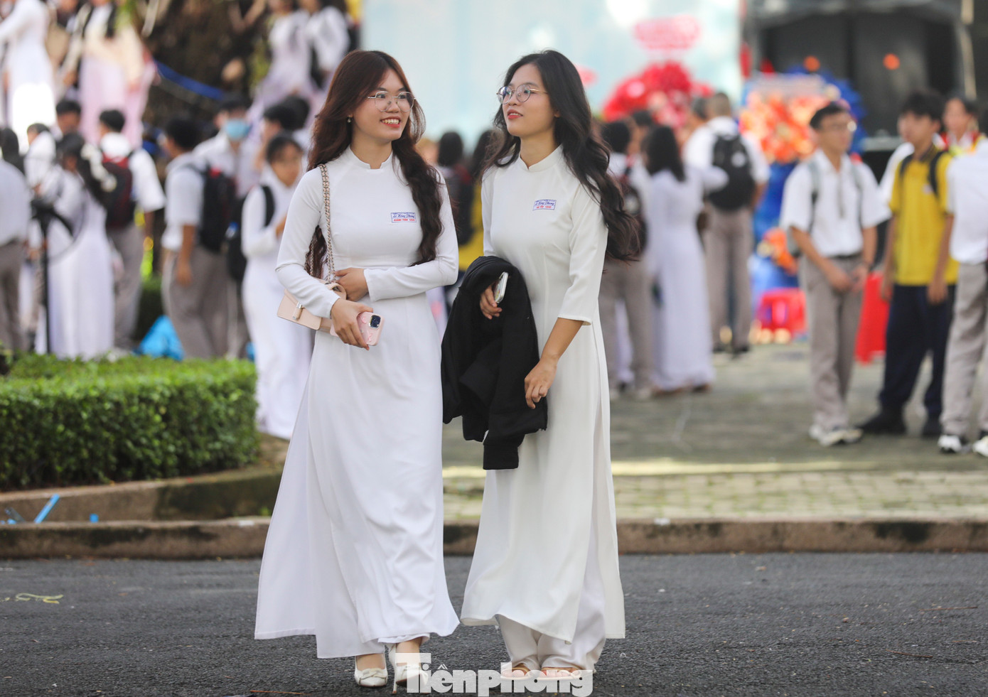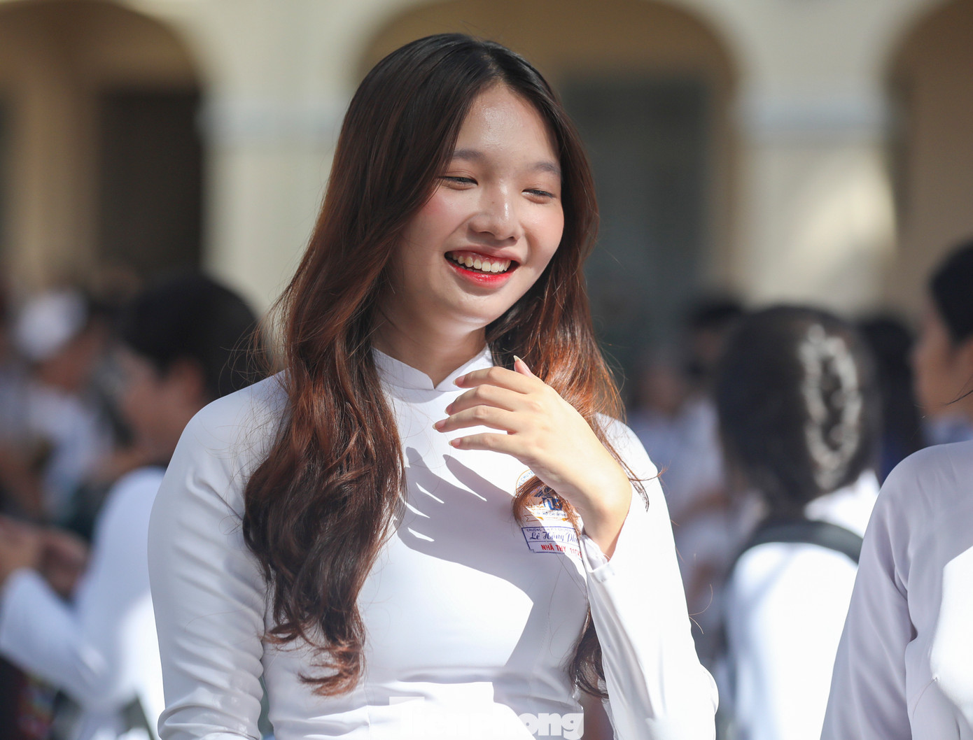 | Những nữ sinh lớp 12 của Trường THPT Lê Hồng Phong rạng ngời trong bộ áo dài, đây cũng là lần khai giảng cuối cùng trong đời học sinh của các em. |