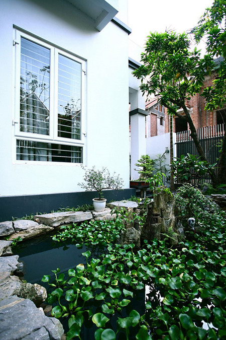 Một trong những yếu tố hoài niệm là sân vườn trước và quanh nhà. Kiến trúc sư Vũ Triều Dương đã thiết kế một ao bèo sát chân tường nhà.