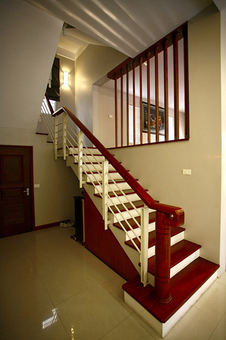 Cầu thang với chất liệu sắt - gỗ đơn giản, trang nhã nhưng có chi tiết đầu tay vịn tinh tế.