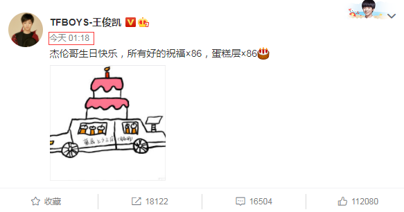 1 giờ 18 phút (tức 0 giờ hơn Việt Nam), chàng fanboy Vương Tuấn Khải đăng hình chiếc xe bánh sinh nhật cùng những ly trà sữa bên trong và gửi lời chúc: “Anh Kiệt Luân sinh nhật vui vẻ nha, chúc anh mọi điều tốt đẹp x86, bánh gato x86”.
