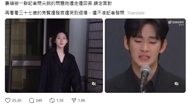 Sau khoảng 17 giờ đăng tải, bài đăng này thu về gần 1 triệu lượt xem, hơn 35.3K lượt thả tim và hơn 1.3K lượt đăng lại. Chủ tài khoản so sánh thái độ của Kim Soo Hyun trong buổi họp báo chiều 31/3 và thái độ của Kim Sae Ron khi cô rời phiên tòa hồi tháng 4/2023, xét xử vụ lái xe gây tai nạn.