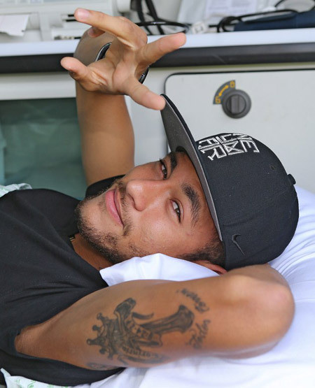 Bị chấn thương ở đốt sống, Neymar không thể tự đi lại. Anh, với đôi mắt còn ngấn lệ, cố làm dấu chữ V (Victory - chiến thắng) gửi đến các đồng đội khi nằm lên cáng để chuẩn bị ra trực thăng.