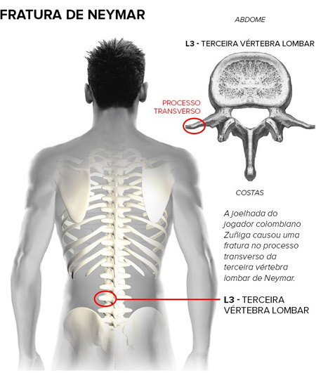 Kết quả kiểm tra sau đó cho thấy Neymar bị chấn thương ở khu vực đốt sống thứ ba ở phần ngang thắt lưng (L3, hay còn lại là Third Lumbar Vertebrae).