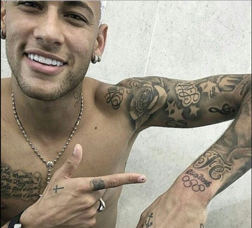 Trên cánh tay trái, Neymar cũng tạo thay đổi bằng một hình xăm mới. Hình xăm này là logo Olynpic 2016, bao gồm dòng chữ Rio2016 đi kèm năm chiếc vòng biểu tượng Olympic.