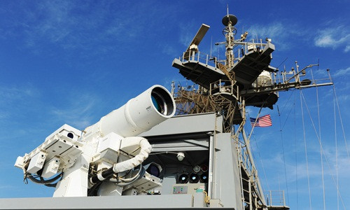 Súng laser được trang bị trên tàu vận tải đổ bộ USS Ponce của hải quân Mỹ. Washington dự tính sử dụng súng laser để làm vũ khí không gian. Ảnh: US Navy.