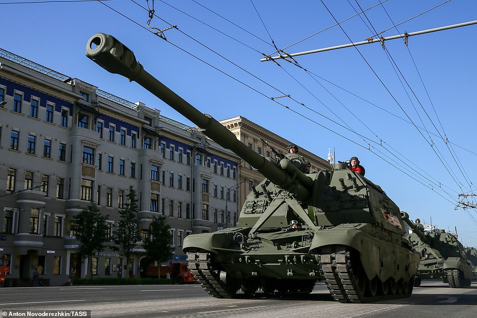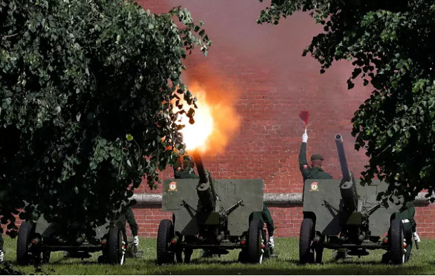 Đại bác khai hỏa trên nền quốc thiều Nga.