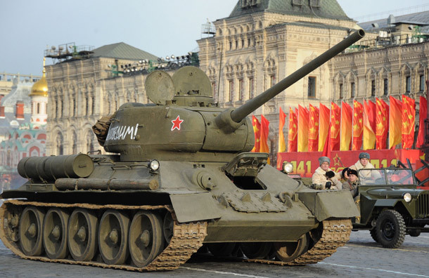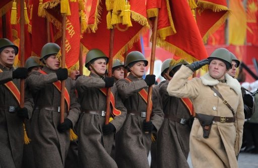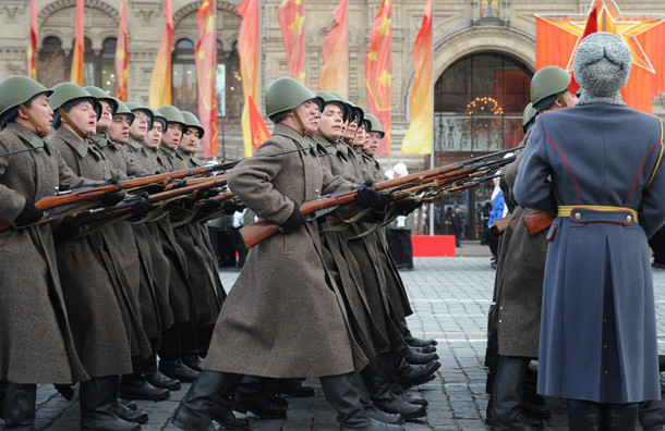 Lực lượng binh lính và sĩ quan cùng mặc đồng phục của năm 1941 và Hồng quân thế chiến thứ hai diễu hành qua quảng trường Đỏ.