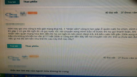 “Tôi gọi điện cho công ty trên thì được nhân viên hẹn gặp ở quán cà phê để nói chuyện. Tiếp xúc với tôi là 2 cô gái, họ cho biết muốn tìm người mang thai hộ thì phải có những thủ tục và điều kiện gì. Lúc kêu tính tiền, 2 cô gái này ngồi im nên tôi phải trả. Các cô ấy còn yêu cầu tôi phải trả 200 ngàn đồng phí dịch vụ tư vấn”, chị Mai thuật lại câu chuyện.