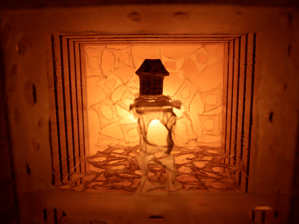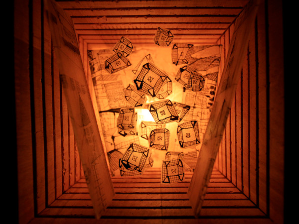 | Các tác phẩm được làm từ giấy xuyến chỉ của Việt Nam và giấy washi của Nhật, được phản chiếu bằng ánh sáng. |