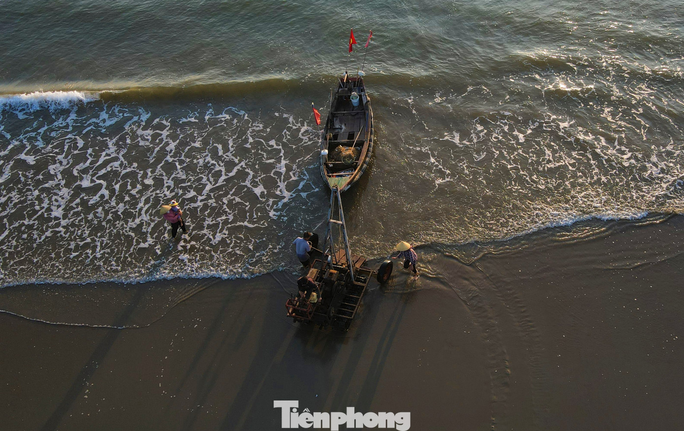 | Mặt trời vừa ló rạng, những đoàn thuyền của ngư dân Nghi Xuân miệt mài thu lưới. |