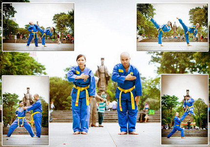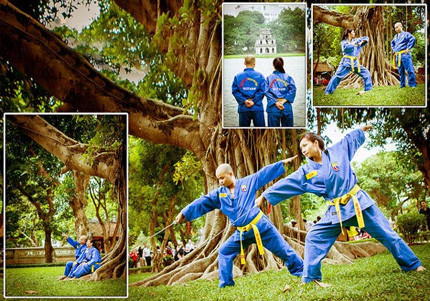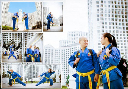 Đến với nhau và yêu nhau từ tình yêu võ thuật nên đôi bạn trẻ Đinh Duy Huấn (SN1988) và Bùi Thị Nga quyết định chụp bộ ảnh cưới mang đậm phong cách võ thuật để kỷ niệm.