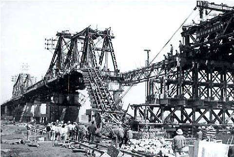 Thủ tướng Phạm Văn Đồng đến thăm công trường khôi phục cầu Long Biên năm 1973.